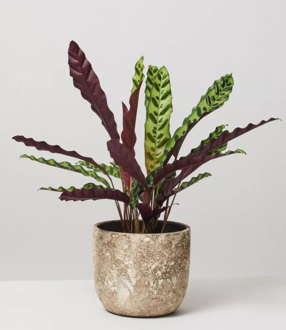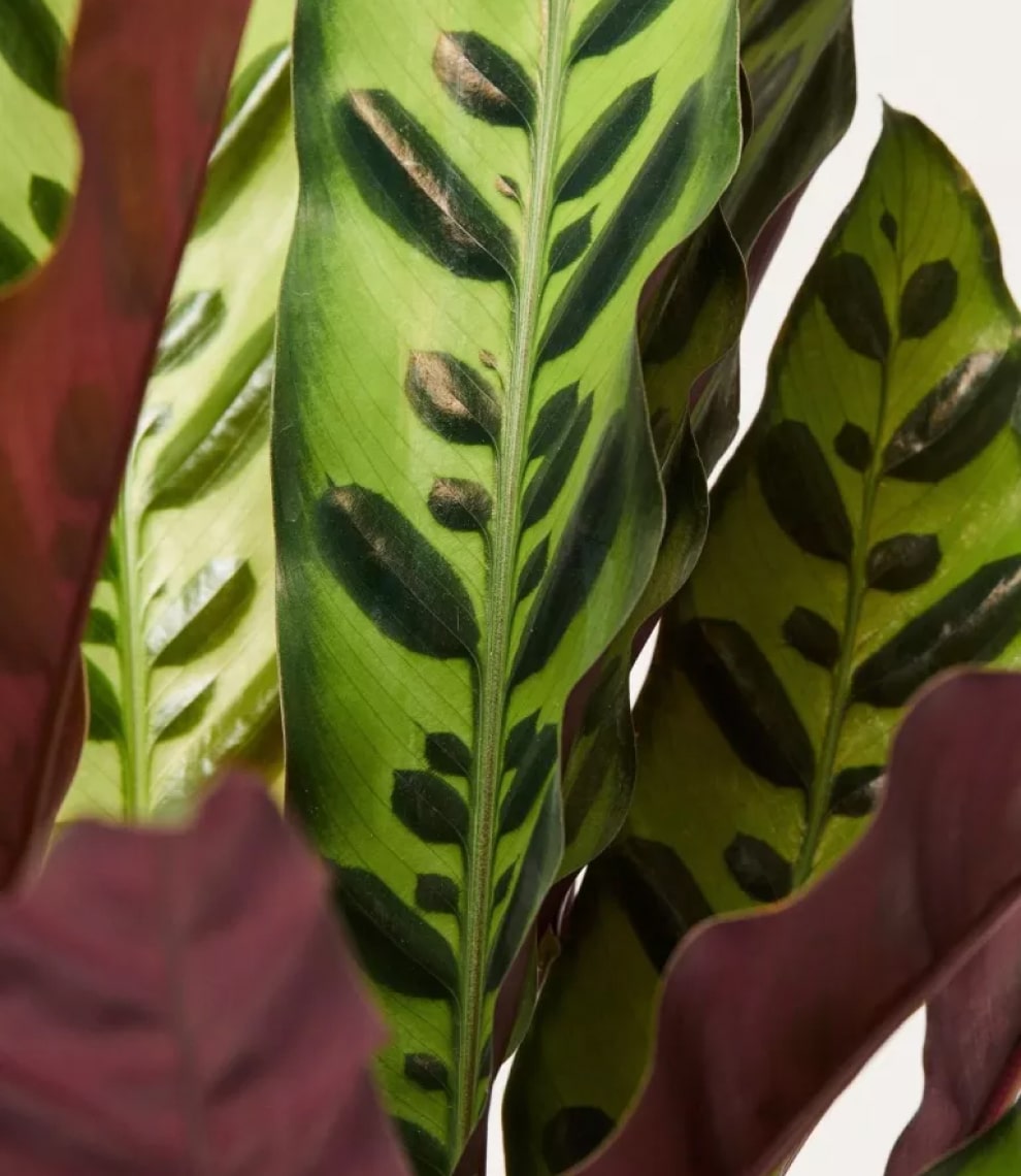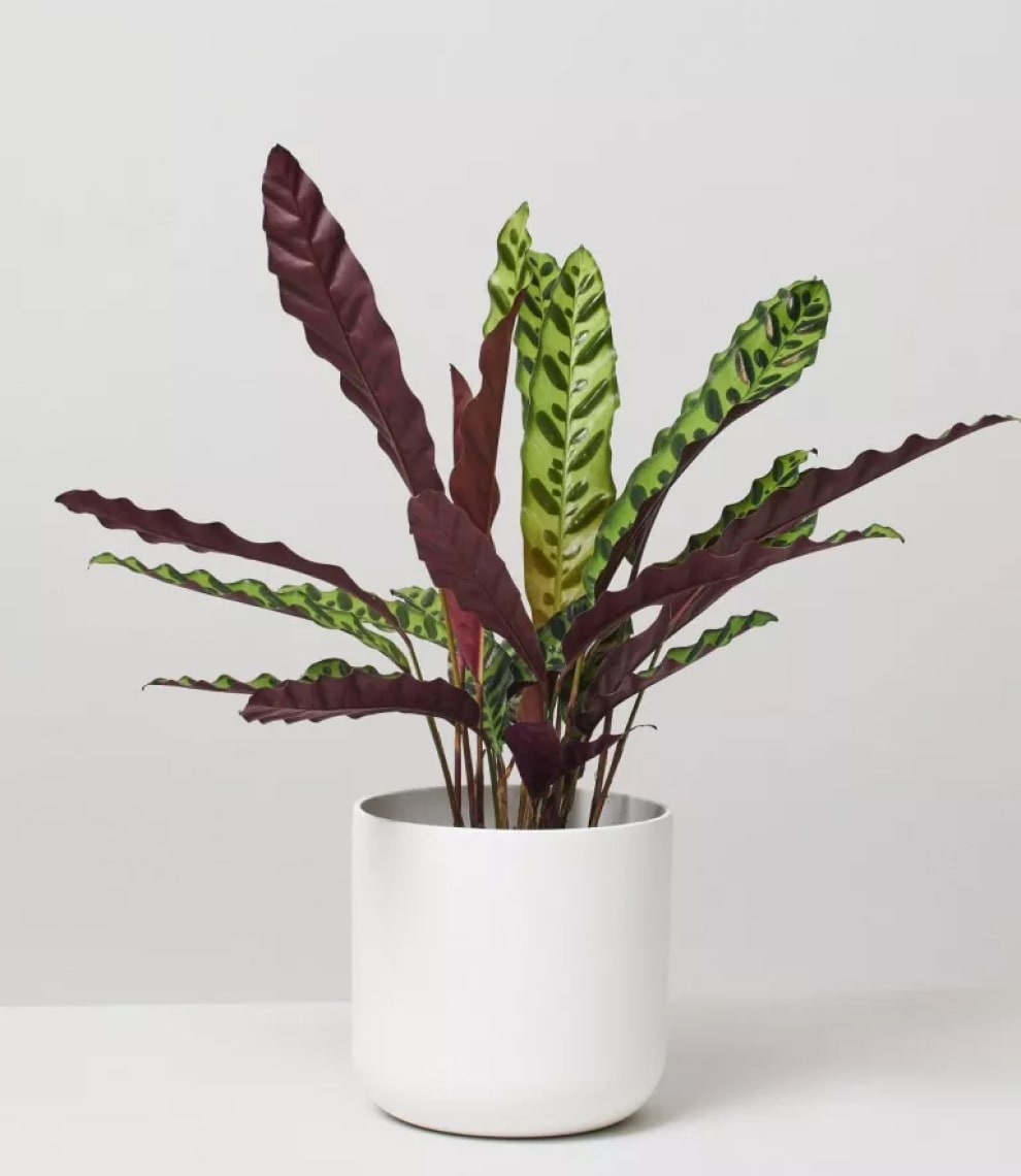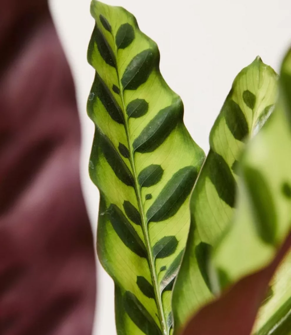 Calathea Pin Stripe or Calathea Ornata are tropical plants with pink pinstripes decorating their large waxy deep green and maroon coloured leaves, which beautifully dance according to the circadian rhythm.