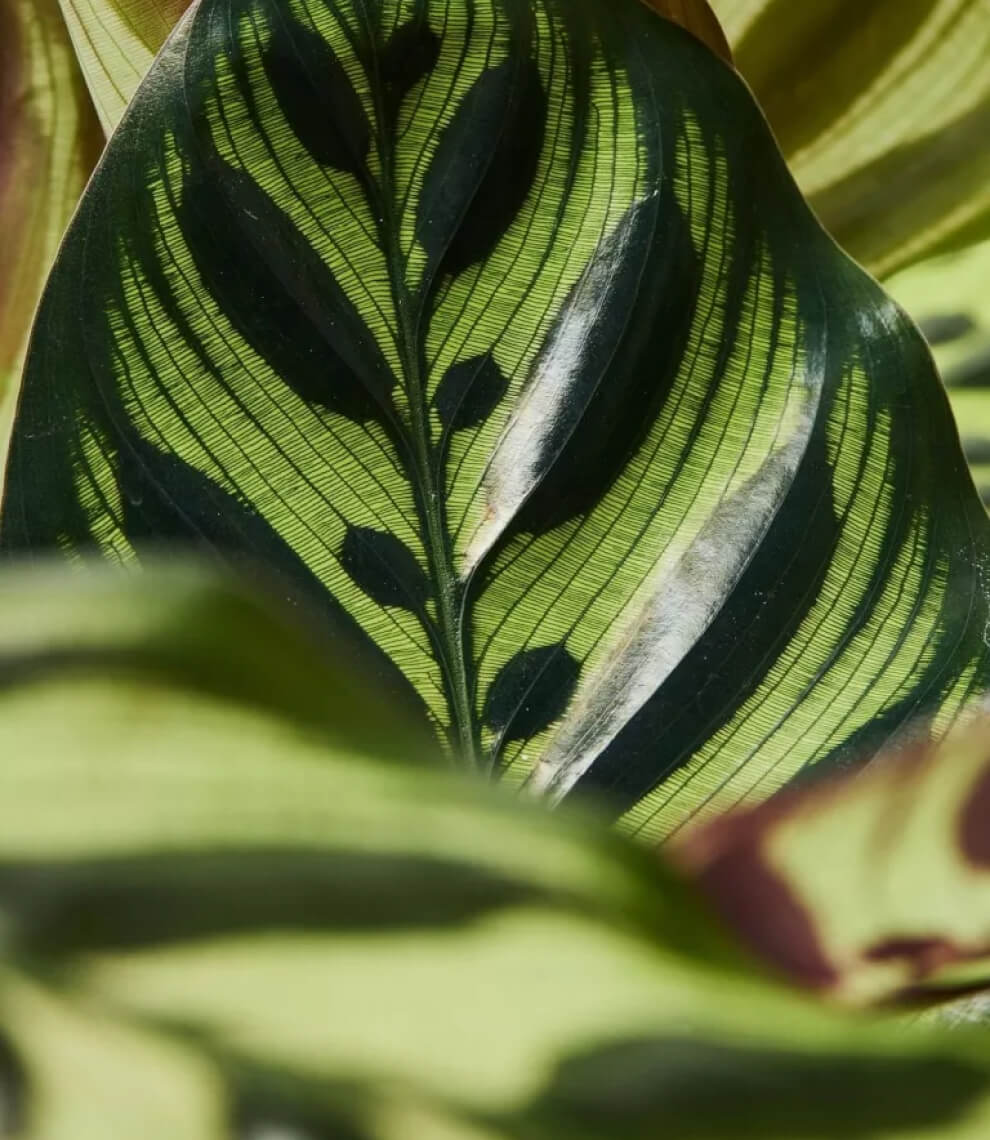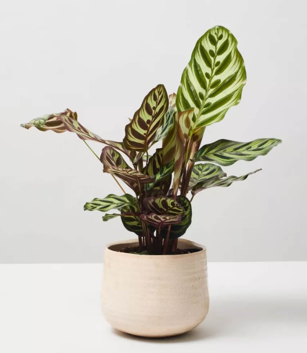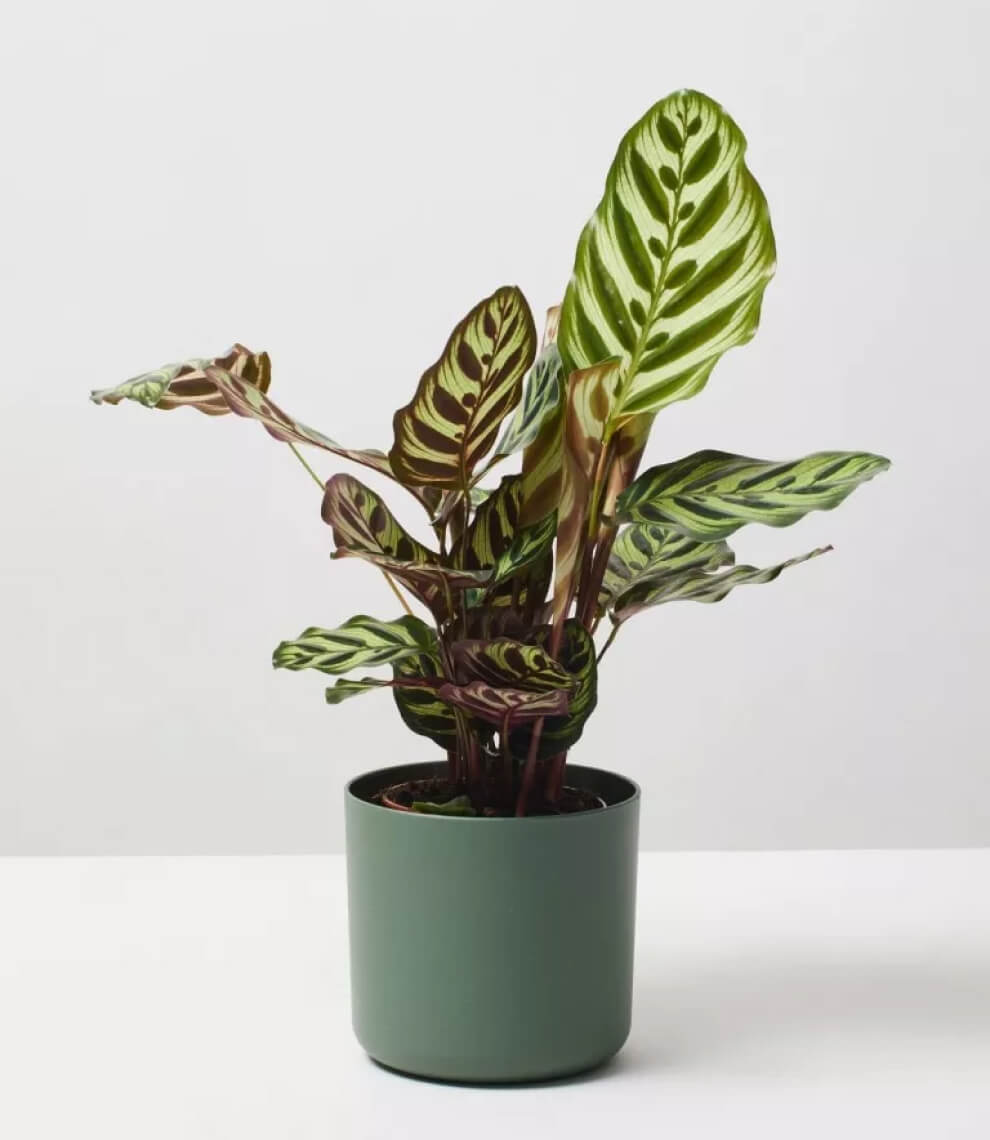 Calathea Pin Stripe or Calathea Ornata are tropical plants with pink pinstripes decorating their large waxy deep green and maroon coloured leaves, which beautifully dance according to the circadian rhythm.